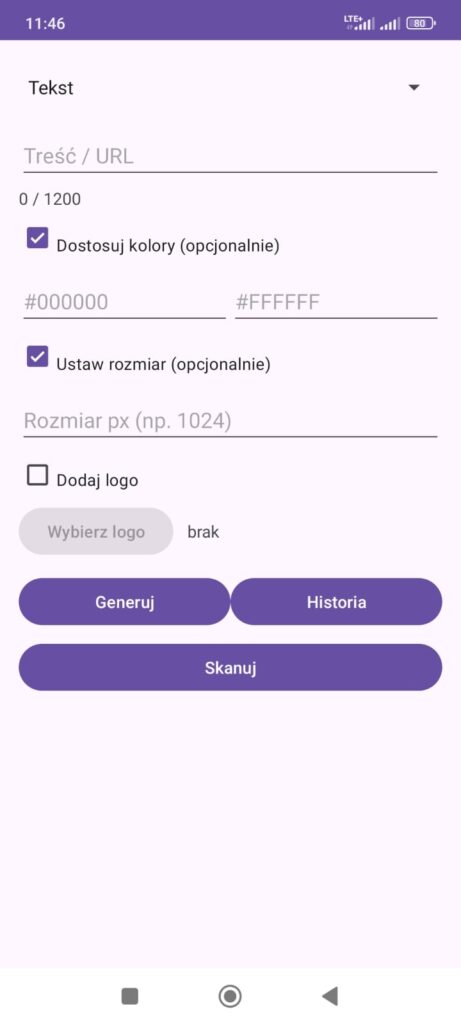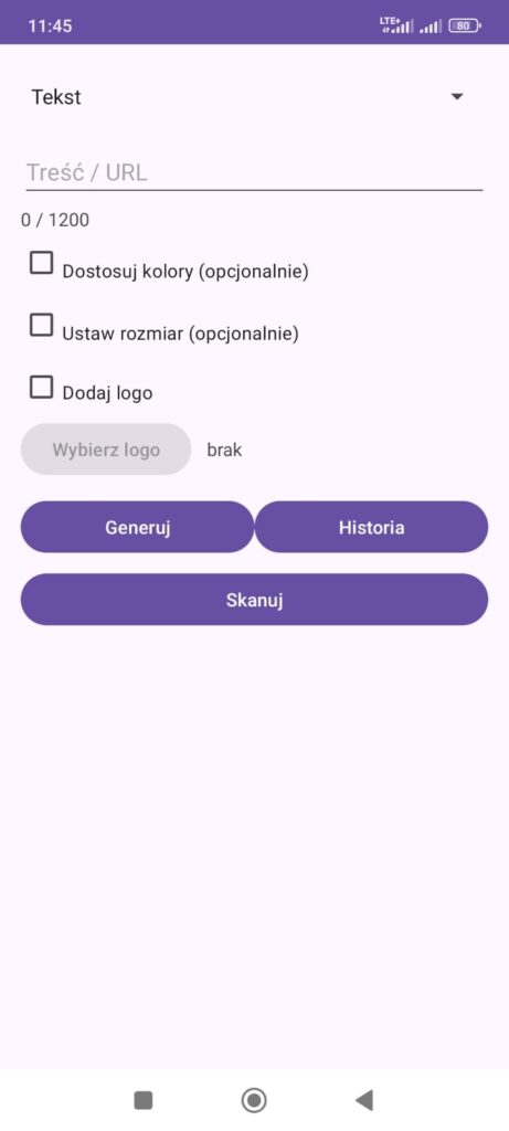 Aplikacja działa offline, obsługuje logotypy, umożliwia zmianę kolorów i rozmiaru kodu oraz zapis w wysokiej jakości PNG. Dzięki wbudowanej historii możesz wrócić do wcześniej wygenerowanych kodów jednym kliknięciem.